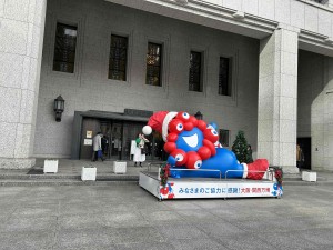 〇先週中央大学の保険フォーラムで立命館大学の赤堀先生と同席し樫原さんの話題で盛り上がりました。樫原さんのことをよくご存じでした。ミャクミャクの後ろ姿です。私も先月大阪に行きました。たぶん大阪市役所前のミャクミャクだと思います。大阪万歳です。写真ありがとうございます。和歌山には高野山に参拝行ってみたいと思っております。大阪も満喫していただきました。大阪は活気のある街です。おめでとうございます。予定以外のコースまで踏破、鉄人です。