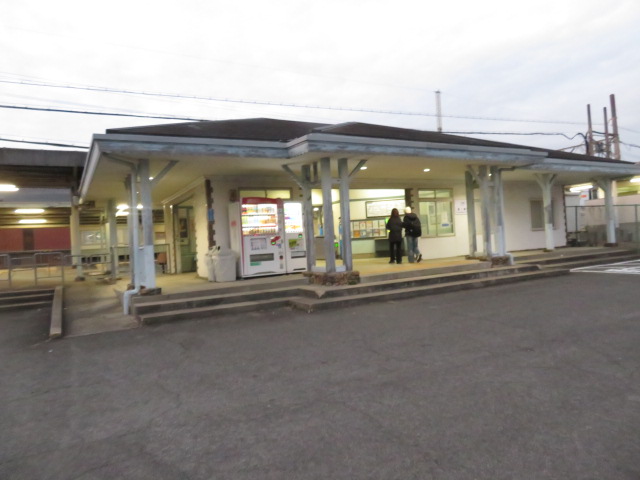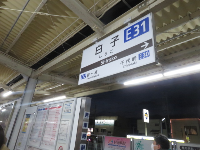 ⑩16時28分より、101歩ある川を渡る。磯山駅には、16時39分に到着する。16時55分より、69歩ある川を渡る。17時11分、踏切道磯山第十二号を横切り、鉄道の右側となる。その先に鼓ヶ浦駅(つづみがうら、17時13分)があった。17時21分、踏切道鼓ヶ浦第二号を横切り、鉄道の左側となる。辺りは暗くなりかけていた。17時26分、地元の人に出会い、「白子駅への道筋」をお伺いする機会を得る。ここでの出会いは大きな助け舟となった。「道なりに8分位歩いた先に白子駅があります」とのことで安堵する。教えて頂いた通りに歩いた先に白子駅(17時37分)があった。万歩計は58,737歩となっていた。