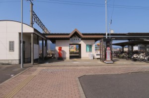 ②9時53分、万歩計で305歩ある六角橋(六角川)を渡る。9時53分、白石町から江北町となる。10時9分、八丁バス停(祐徳バス)前を通過。駅舎名の通り、山を背後に肥前山口駅(10時54分)あり。