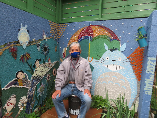 30分位、豪邸の伴さん宅のガーデンを鑑賞させて頂く。ガーデン一面には多種多様の植物があり、丹精込めて育てあげた庭木が我々を出迎えてくれた。特に、色なアイデアを駆使し丁寧に仕上げた、「トトロをテーマとした芸術的な作品」には、感服そして感動また感動の連続であった。驚いたことに、不要になったものを軸に有効利用し、数ヶ月の歳月を要し手弁当で作成したとのことであった。多種多様の植物を見ると、親父が健在だった頃の盆栽創りを思い出した。また、トトロのネーミングを聞いて、2020年2月、日豊本線の踏破で立ち寄った土々呂駅を思い出し、感無量となった。