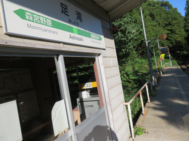 ➅15時8分より車道と歩道が分離した洞門を通過する。万歩計で533歩(後半の137歩は車道と歩道が合体)あった。遠くに橋が見える。15時26分より174歩ある橋を渡る。橋を渡った先でT路地があり、川沿いを歩くか坂を上りるか迷う。地図を見て、川沿いを歩くことにする。そろそろ足滝駅だと思い、ラッキーにも住人と対面。「ここから林の中に駅が見えるでしょう。道路から急な斜面を上った先に足滝駅はあります」と教えて頂く。しかし、上るような道筋はなく右往左往する。偶然にも別の住人に出会い、「この道を上れば行けます。帰りは別の道を下れば、幹線道路に戻れます」と教えて頂く。急な坂道を上り、足滝駅には15時48分到着。この駅に新潟県在住の乗り鉄ファンが先客としておられびっくり。冒頭にあるような会話をしてこの場を過ぎ去る。時間に余裕があれば、この鉄道ファンと鉄道に関して意見交換をしたかったが出来ず誠に残念。