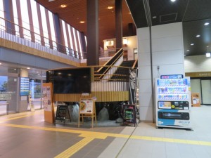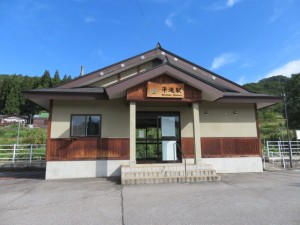 ④越後鹿渡駅からは信濃川を挟んで国道117線ではなく、県道49号線を歩く。すなわち、信濃川を適宜見ながら花道を歩く。12時45分、越後川口方面に向かう列車と対面する。13時11分、道路標識にあった外丸という名の郵便局前を通過。いつの間にかJR線が右手側にあった、駅舎に温泉の設備がある津南駅には13時33分到着。丁度飯山方面に向かう列車が到着する場面に遭遇する。温泉と直結した駅は奥羽本線の赤湯駅やわたらせ渓谷鉄道の水沼駅で見かけた。懐かしくなる。この駅には駅員がおられた。「越後田中駅への道筋は、橋を渡らないと行けない」とお伺いする。また、駅員さんに先程到着した列車はこれまでの車両と異なる色彩について確認したところ、「臨時列車との」ことであった。飯山駅で見かけた駅舎のポスター写真は津南駅のように思えた。