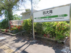 ④9時43分、木と鉄道が印象的な地点を通過。9時54分、境川踏切を横切り鉄道の左側となる。9時56分、県道408号(箕作飯山線)にある飯山市大滝前を通過。10時12分、野沢温泉14㎞、長野53㎞と記した標識前を通過。10時13分、信濃川発電所(東京電力)前を通過。開業100周年とPRした西大滝駅には10時22分到着。この駅の界隈は袋小路状態にあり通り抜けはできず。それ故、幹線道路に再度戻り、桑名川駅を目指すことにする。