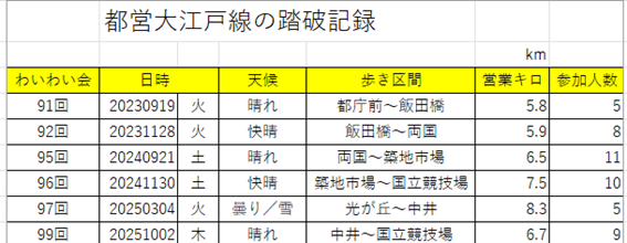 2025年10月2日(木)晴れ、第99回わいわい会(高松一高同窓の歩き会)は、総勢9名(反省会メンバーも含む)で。秋の青空の下、都営大江戸線の中井駅から国立競技場駅までの営業キロ6.7㎞に挑戦する。今回の歩きで下記の日程で大江戸線(総営業キロ40.7㎞)をわいわい会にて6回に分けて踏破が完成する。主幹事ととしてケジメがつけられホッとする。因みに大江戸線の歩きは、単独歩きなどで都合3回目の踏破となった。