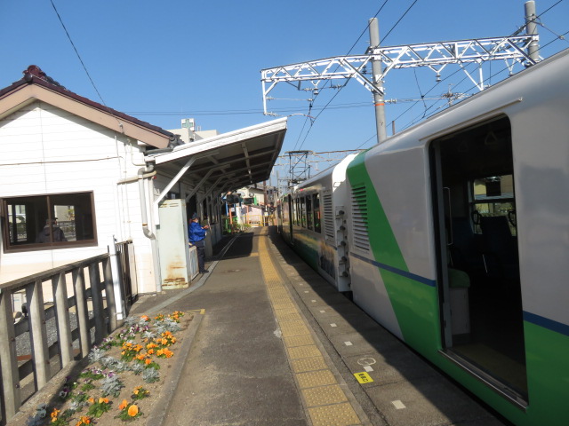 ⑩16時28分より、101歩ある川を渡る。磯山駅には、16時39分に到着する。16時55分より、69歩ある川を渡る。17時11分、踏切道磯山第十二号を横切り、鉄道の右側となる。その先に鼓ヶ浦駅(つづみがうら、17時13分)があった。17時21分、踏切道鼓ヶ浦第二号を横切り、鉄道の左側となる。辺りは暗くなりかけていた。17時26分、地元の人に出会い、「白子駅への道筋」をお伺いする機会を得る。ここでの出会いは大きな助け舟となった。「道なりに8分位歩いた先に白子駅があります」とのことで安堵する。教えて頂いた通りに歩いた先に白子駅(17時37分)があった。万歩計は58,737歩となっていた。