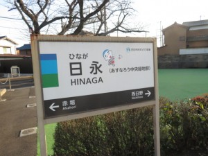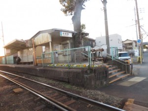 ⑪12分位の待ち合わせで、想定通り、西日野行きの電車がやってくる。西日野駅には数分で到着する。西日野駅を種々のアングルで撮影後、15時54分日永駅に向けてスタートする。鉄道の左側を歩く。踏切道日永第1号を横切り、鉄道の右側となる。天白川に沿って、淡々と歩いた先に45分前に立ち寄余った日永駅(16時21分)があった。