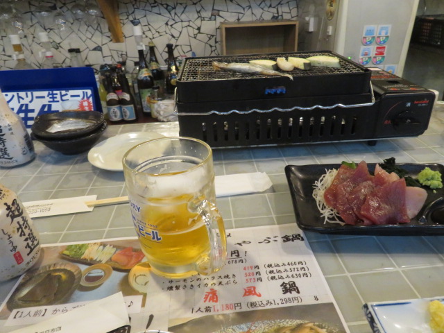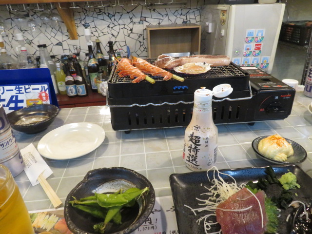 ⑬ホテルで汗を流した跡、1番商店街にある鮮魚・浜焼き・活具:海鮮丼”えびす市場”にお邪魔し、四日市の最後の夜を堪能する。マスターも含め、3人の若者との会話は至福のひと時であった、