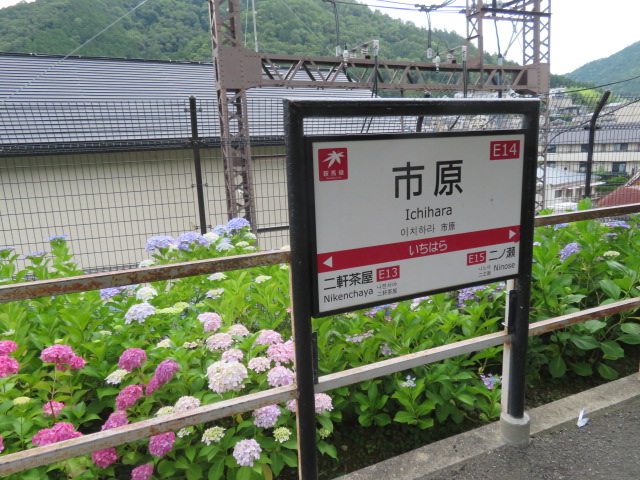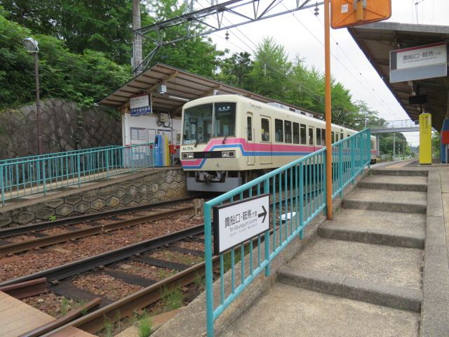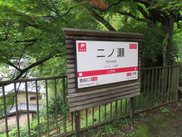 ②8時40分、貴船神社の鳥居前を通過。近くの道路標識は上賀茂6㎞、堀川北大路8㎞とあった。川に沿った山道を淡々と下る。途中、二ノ瀬トンネルがある分岐点に差し掛かる。運よく通行人の方に出会い、鞍馬川に沿った道路かトンネルがある幹線道路を進むべきかをお伺いする。予想通り、「二ノ瀬駅は前者の道筋です」と教えて頂く。本日唯一の分岐点であった。暫く鉄道と川に沿った山道を歩く。今歩いている路筋から50m位行った先で、川岸の向こうの高台に駅舎らしいのを発見。周りの環境から少し戻った先に二ノ瀬駅への道筋があるに違いないと判断し引き返す。想定通り、バス停の二ノ瀬駅がある地点から二ノ瀬駅への道筋があった。運よく地元の人と対面。「道なりに歩いた先に二ノ瀬駅があります」と教えて頂く。細い路を30m位上った先に二ノ瀬駅(8時58分)があった。叡電でこの駅舎踏破が今思えば一番難しいかった。