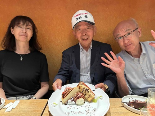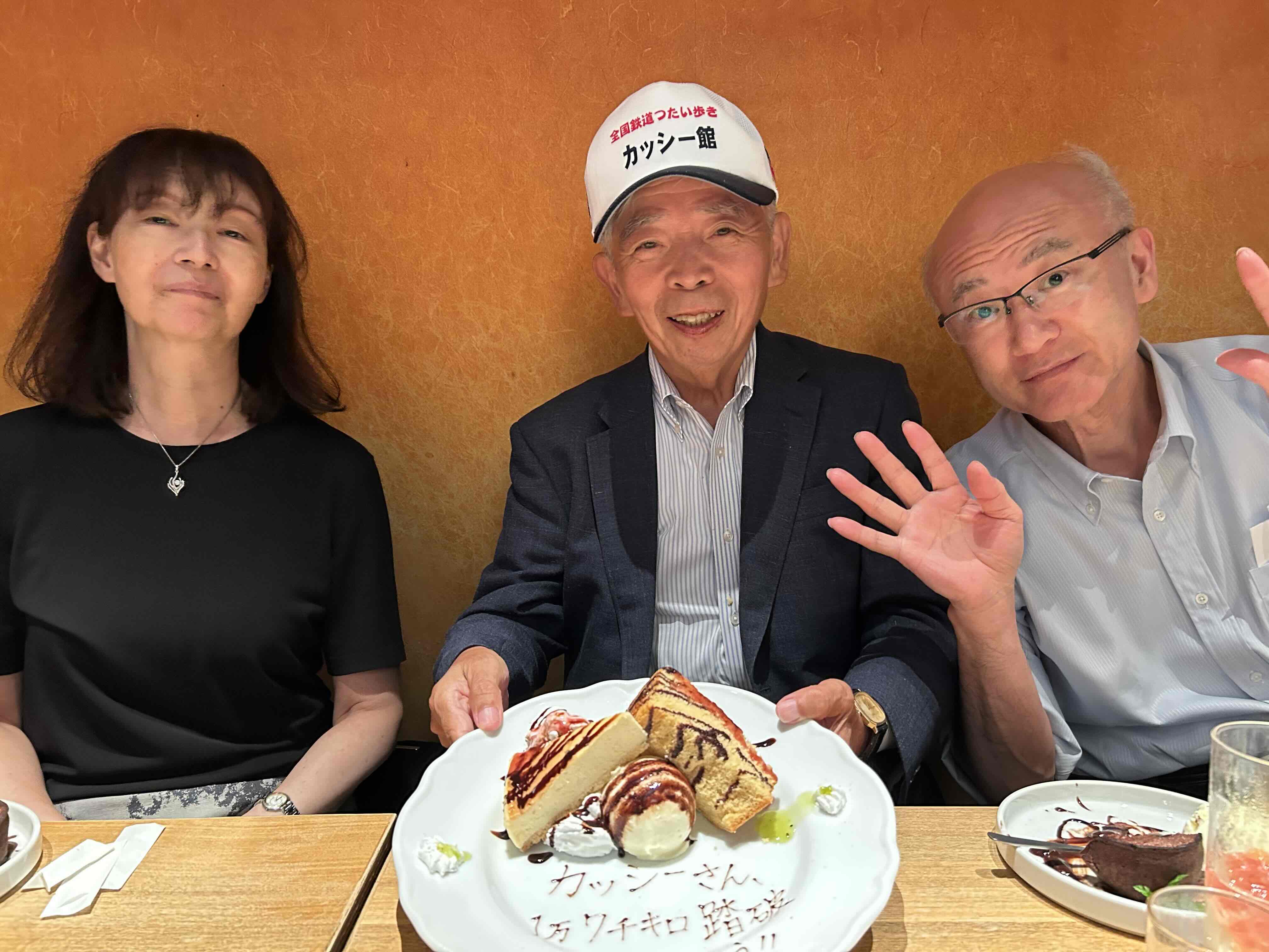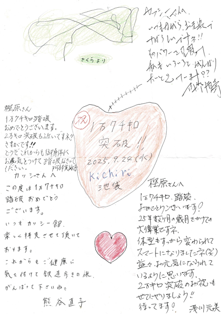 2025年9月24日(水)、かつてお世話になったみどり生命の仲間に、2025年7月31日(木)、伯備線の伯耆大山駅で1万7千キロを達成したお祝いを、2年前の1万5千キロ踏破のお祝いに引き続き、エソラ池袋ビル8階にある”Kichiri”でして頂く。加えて、私が思いつきで用意した寄せ書き用紙にお祝いの言葉などを署名頂く。感謝また感謝。あっという間に楽しい時間が過ぎ去る。熊ちやんタイムリーなご対応かつライン上”カッシー館ファンクラブの開設”など細かな気配りありがとうございました。