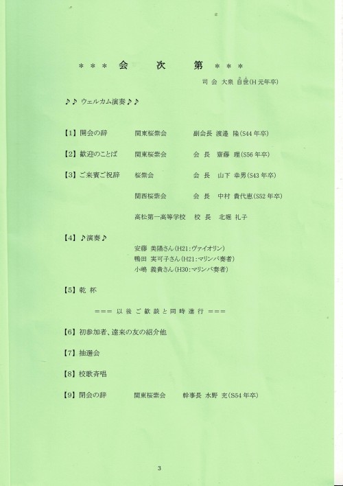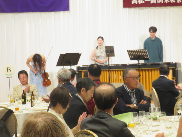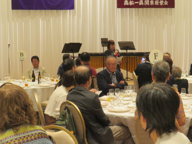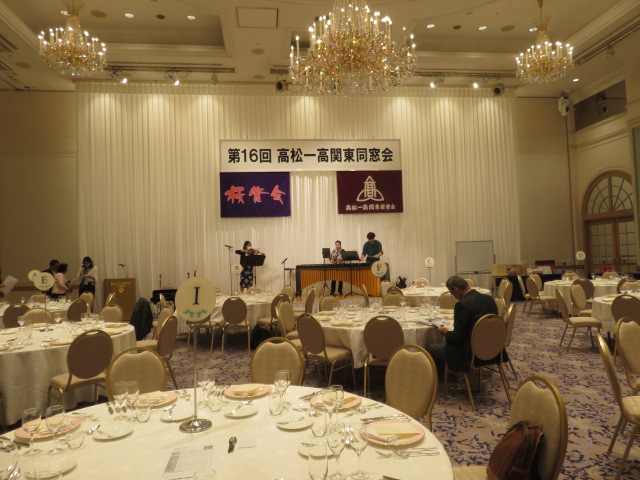 2025年10月18日(土)晴れ、高松一高関東桜紫会(齋藤理会長)による、第16回高松一高関東同窓会が、総勢107名の参加を得て、第一ホテル東京(新橋)ㇻ・ローズで11時半より約3時間にわたり、下記の会次第に基づき盛大に開催される。2年振りに同窓の仲間と旧交を温めさせて頂く。多くの若手の参加あり、ウエルカムドリンクあり、約1時間にわたる楽しい演奏会あり、くじ引きありの充実した3時間余の同窓会であった。