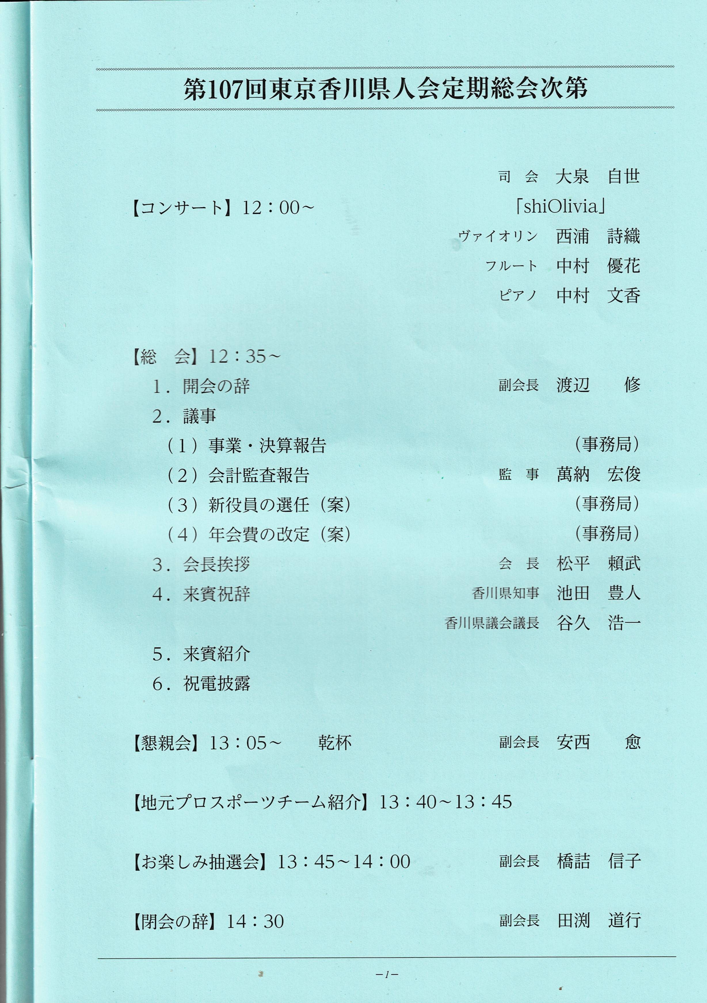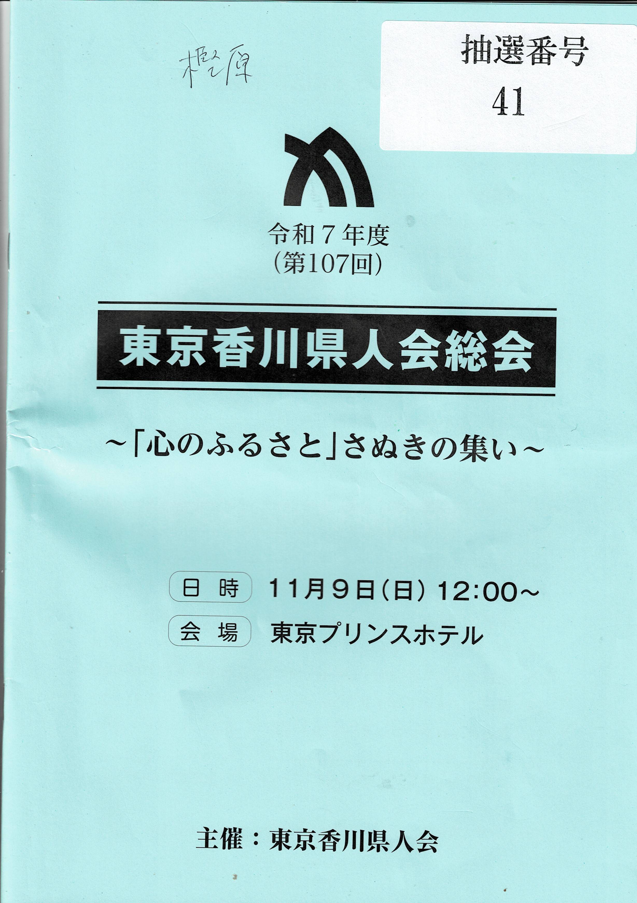 On Sunday, November 7, 2025, rain, the 107th Tokyo Kagawa Prefecture Association General Meeting (President: Yoritake Matsudaira) will be held grandly from 12:00 PM at the Tokyo Prince Hotel (2nd floor, ‘Hōō Room’), with over 260 participants, based on the following agenda.