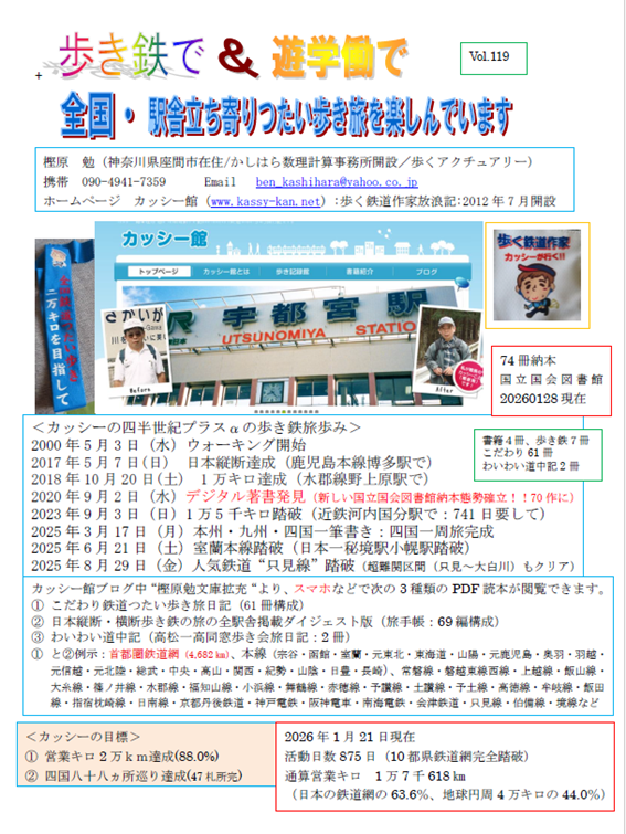 明日から約1カ月振りにに9泊8日で、75作目著書(久大本線・佐世保線)の執筆を目指し、久大本線仕上げ(天ケ瀬~黒目:営業キロ59.5㎞)と佐世保線(48.8㎞)の踏破に挑戦。加えて、時間的に余裕ができれば松浦鉄道(佐世保~松浦:58.2㎞)の一部にも足を踏み入れたい。また、今回の旅は、偶然にも75作目著書の節目となり、久留米で大学友人との再会や武雄温泉での宿泊も予定しており、ここ最近の旅に比べ、楽しい鉄道つたい歩きの旅になりそうである。なお、首都圏や近畿圏などの鉄道網に比べ、ダイヤ数が極めて少ないので、果して有言実行なるか不安であるが。詳細は、2月20日以降のカッシー館ブログで。