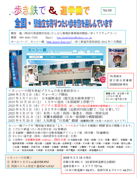 明日から半月振りに7泊8日で、76作目著書(和歌山線・桜井線など:除く近鉄線)の執筆を目指し、下記の鉄道網(総営業キロ151.8㎞)に挑戦。そして、和歌山県と奈良県の鉄道網を完全に踏破したい。加えて、近鉄線の完全踏破(残るは、けいはんな線18.8㎞・信貴線2.8㎞)にも迫れる。今回の旅が成功すれば、首都圏鉄道網(東京・神奈川・千葉・埼玉・茨城・栃木・群馬・山梨)、香川、徳島、和歌山、奈良を走る12都県の鉄道網(JR在来線・私鉄・地下鉄・モノレール・路面電車)を踏破できる。果して有言実行なるか?詳細は、3月18日以降のカッシー館ブログで。