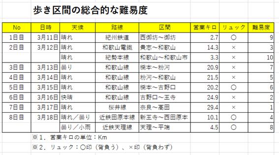 ①歩き当初の鉄道案内人(線路・電柱)による鉄道つたい歩き方法では、また地図にたよる歩き方では、今回の路線を円滑に踏破することは困難であると痛感する。すなわち文明の利器であるスマホを活用しなければ、踏破が困難な区間が多々登場したからだ。因みに、今回の区間の難易度は次表の通り。
