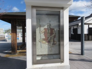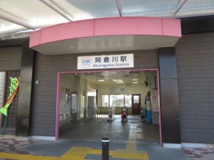 ②9時16分、滝川公園があった。9時23分、萬古神社で本日の安全を祈願する。この神社前に、ばんこの里会館があったので立ち寄り、10分位、館内にある作品(陶芸工房、ばんこ焼)を鑑賞させて頂く。特に、玄関先に展示されていた福助が強く印象に乗った。それは、2011年8月、尾道商業会館所記念会館の福助を思い出したからである。9時40分より、185歩ある海蔵橋(海蔵川)を渡る。9時47分、日本橋まで393.4㎞と記した地点を通過する。9時57分、踏切道阿倉川第一号踏切を横切り、鉄道の左側となる。200m位戻った先に阿倉川駅(10時)があった。