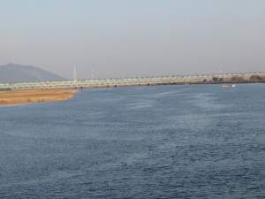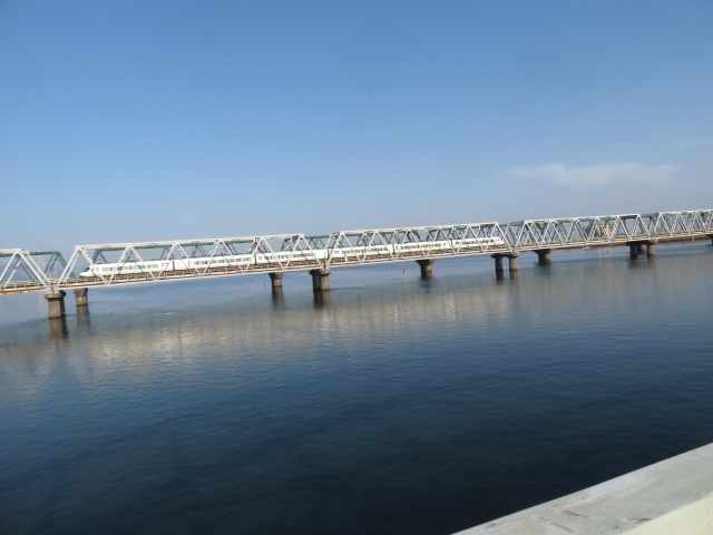 ②9時21分、国道13号線に合流する。この辺りで日本橋まで377.7㎞とあった。9時30分、名古屋26㎞、弥冨4kmと記した地点を通過。9時32分より、1,555歩ある尾張大橋(木曽川)を渡る。この橋でJRや近鉄の車両が7から8便通過して行く。9時52分、この橋を渡ると三重県桑名市から愛知県弥富市となる。9時54分、前ヶ須西で静岡197㎞、豊橋79㎞、名古屋25kmと記した標識前を通過。近鉄弥富駅には10時8分に到着する。この駅前には公衆トイレがあった。名鉄線とJR線の弥富駅は少し離れた先にあった。
