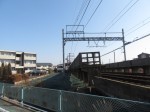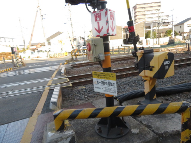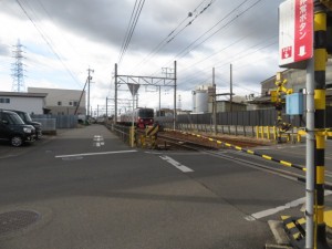 ⑥12時45分、踏切道蟹江第1号を横切り、鉄道の右側となる。12時47分、桑名方面に向かう各駅停車の2両編成と対面する。これまで観察したところ、特急と急行は6両編成。各駅停車は3両が軸で、四日市で切り離し作業した場合、四日市~津新町などの区間で2両編もある。12時49分、右手に蟹江中学校がある。12時54分より、54歩ある福田川を渡る。この”福田”のいうネーミングも見て、わいわい道中記50回記念号の巻頭言を執筆頂いた.故福田博様を思い出ししんみりとなる。12時55分、椿通を通過する。13時8分、戸田駅があり、踏切を挟んで上り下りのホームがある。