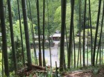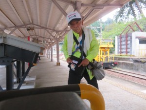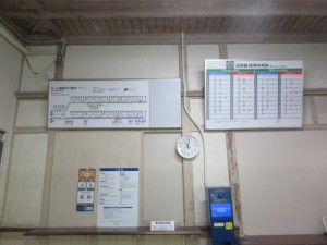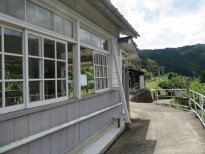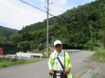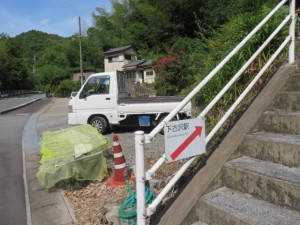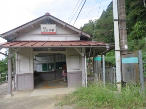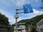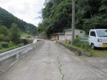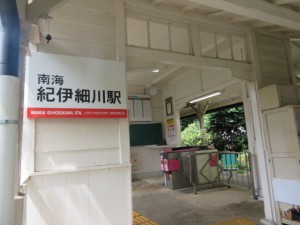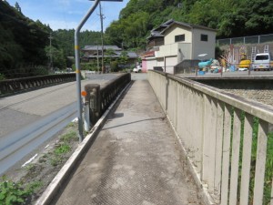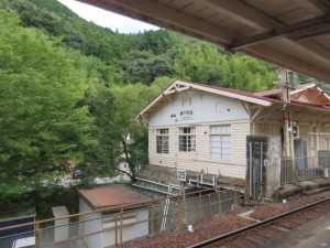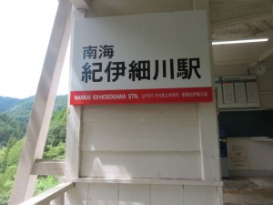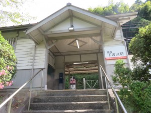 ④くねくねした道筋を歩き、国道370号線を目指す。13時32分、33歩ある新宮前橋を渡る。この橋を渡り、13時36分、国道に合流する。13時42分、九度山町中古沢を通過。13時48分、やっと自動販売機に巡り合える。15時47分、37歩あるつら橋を渡る。その先で国道から右折し、くねくねした坂道を上る。下古沢駅には14時に到着する。安堵したこともあり、この駅舎で持参したお握りで遅いランチとする。ここでも住人の方と出会う。「極楽橋からやって来ました」とあいさつ代わりにしゃべらせていただくと、「驚いた様子で紀伊細川までの道のりは大変だったでしょう。頑張って下さい」と激励を受ける。カッシーチラシを手渡し、お礼を言ってこの場を去る。