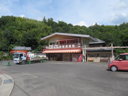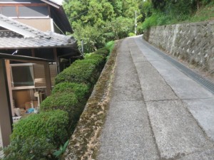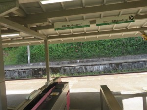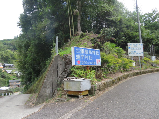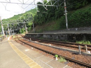②11時6分、紀伊細川第1号踏切道を横切り、鉄道の左側となる。11時15分、民家がある。11時28分、上り下りの車と対面する。11時45分、民家が拡がる。11時45分、前方中腹に紀伊細川駅を見つける。道路から30m位の高台にあった。11時50分、八坂神社で本日の安全を祈願する。11時52分より、急な階段を上る。紀伊細川駅には11時57分に到着する。