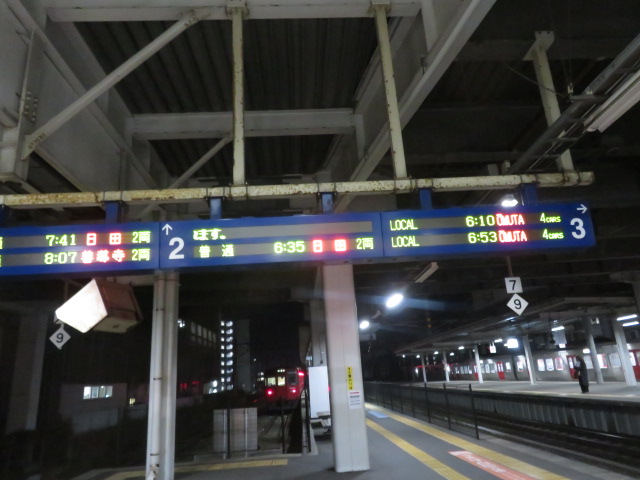 2026年2月13日(金)快晴、西九州の旅の2日目は、久大本線の天ケ瀬駅から夜明駅までの営業キロ20.4㎞に挑戦する。各駅停車での天ケ瀬駅までの移動は、久留米発6時11発の大分行きしかなく、寝坊しないよう用心深く就寝を余儀なくされる。それ故、気持ちが高ぶり、深夜2時を過ぎても寝ることができず。2015年6月の宗谷本線の旅を思い出した。あの時は南稚内発が5時22分であった。この時間帯に比べれば、50分遅いが、精神的には同じような状況でプレッシャーを強く感じた。このプレッシャーをゆるめるため、万一寝坊した場合には、久留米発8時25分の特急ゆぶ1号で移動すればいいと開き直る。この決断が功を奏し浅い睡眠であったが、2時間程寝ることができ安堵する。4時過ぎに起床し、昨日コンビニで購入したおむすびを頬張り、5時50分頃ホテルを出る。辺りは暗闇であった。2番ホームには2両編成の非電化車両が停車していた。田主丸駅と夜明駅で上り列車と離合がある。夜明駅辺りで少し辺りが明るくなる。