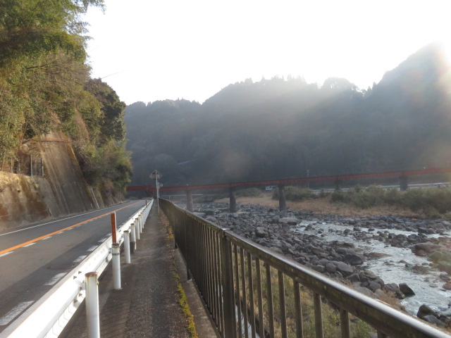 ①1年前の天ケ瀬駅を思い出し懐かしくなる。駅前に暫く立ち止まり、種々のアングルで撮影後、豊後中川駅を目指す。7時45分、15m位ある階段を上り国道210号線に合流する。7時50分、久留米58㎞、日田16㎞と記した標識前を通過。7時52分、JR線下を潜り、鉄道の左側となる。7時58分、久留米東櫛原まで56㎞地点前を通過。8時より、244歩ある湯山橋(玖珠川)を渡る。これから、玖珠川に沿って歩く。8時6分、久留米まで55.5㎞地点を通過。8時12分、神の釣バス停(日田バス)前を通過。8時21分より、やまのつる橋(418歩)を渡る。川を渡ると、8時25分より、228歩ある池ノ原トンネルを通過する。8時28分、JR線を跨ぎ、鉄道の右側となる。2両編成の各駅停車車両が久留米方面に向かって通過して行く。橋を渡り、玖珠川ぎ右手となる。8時38分、JR線下を潜り、線路の左側となる。8時46分、久留米まで53㎞地点を通過。8時56分、JR線下を潜り、鉄道の右側となる。9時2分、下り釣バス停前を通過。豊後中川駅には9時12分に到着する。